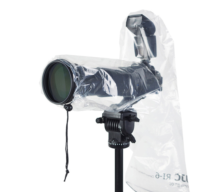 Дождевая накидка JJC RI-4C состоит из 2 элементов: RI-5 используется, когда камера применяется без вспышки ,а RI-6 устанавливается дополнительно, когда накамерная вспышка нужна. Накидки выполнены из плотного прозрачного полиэтилена, что позволяет использовать дисплей камеры и все органы управления.  Чехол можно использовать со штативами и моноподами. Благодаря затягивающемуся шнурку чехол плотно прилегает к объективу (рекомендуем использовать бленду). Чехол JJC RI-4C также может использоваться для защиты от мокрого снега, пыли, песчаных бурь, жидкой грязи и так далее. Ограничение по размерам объектива: не более 45 см в длину, не более 17 см в диаметре.