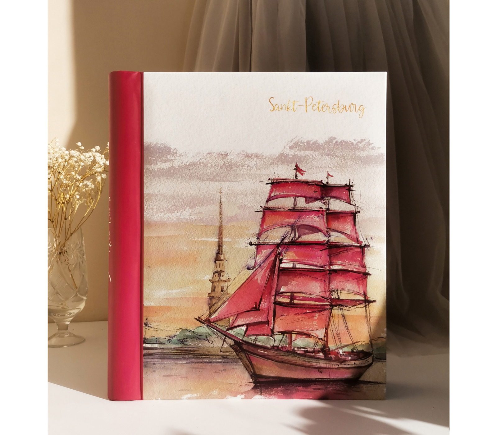 Магнитный альбом для фотографий. Магнитные листы также подходят для размещения рисунков произвольного формата, открыток, билетиков, картинок желаний, вырезок и прочего. Фотографии могут располагаться в произвольном порядке – вертикально, горизонтально или по диагонали. Твердая обложка с изображением знаменитого парусника с алыми парусами на фоне шпиля Петропавловского собора выполнена из картона, бумажные листы с магнитной пленкой скреплены пластиковой спиралью. Альбом отлично подойдет для фотографий школьного выпускного или на память о путешествии в Санкт-Петербург.